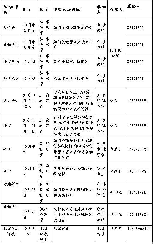 ⑵ 召开专题研讨;公共事业管理专业于4月16日、4月23日分别围绕“课程内容如何协调整合”、“讲课技巧研讨”进行了研讨”;会计学专业5月28日开展了教学观摩与教学方法、手段改革讨论;市场营销专业6月11日开展如何改进教学方法和教学手段的研讨等等。
