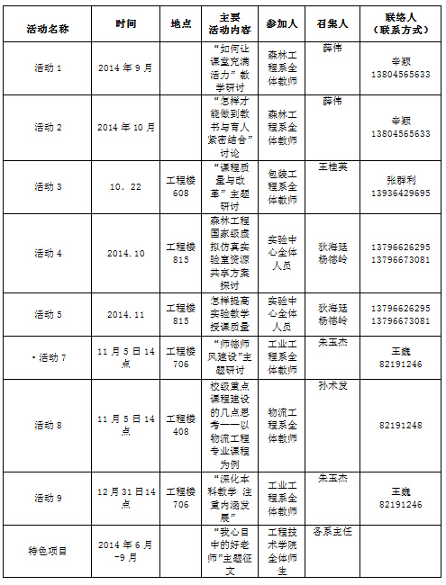 (一)森林工程系分别在2014 年4 年18 日上午10 点在工程楼412 开展了“如何改进教学方法和教学手段”活动、2014 年5 月7 日下午2 点在锦绣楼T101 开展了“如何强化教师教书育人的责任意识和质量意识”活动、2014 年5 月12 日上午10 点在丹青楼412 开展了“如何进行考试方法改革”活动,通过以上一系列活动,老师们在思想上有很大提高,纷纷表示在今后的工作中遵守以下职业道德规范: