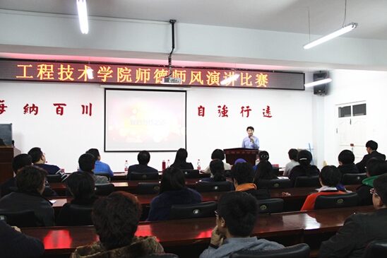2015-07-24 工程技术学院继2014年11月12日成功举办了以《我心目中的好老师》为主题的师德师风学生系列演讲赛之后,于2014年11月26日下午2点在工程楼915再次成功举办了以《我的师德师风观》 为主题的师德师风系列演讲赛之二-教师演讲比赛。学院的全体教师和部分同学观看了演讲比赛。